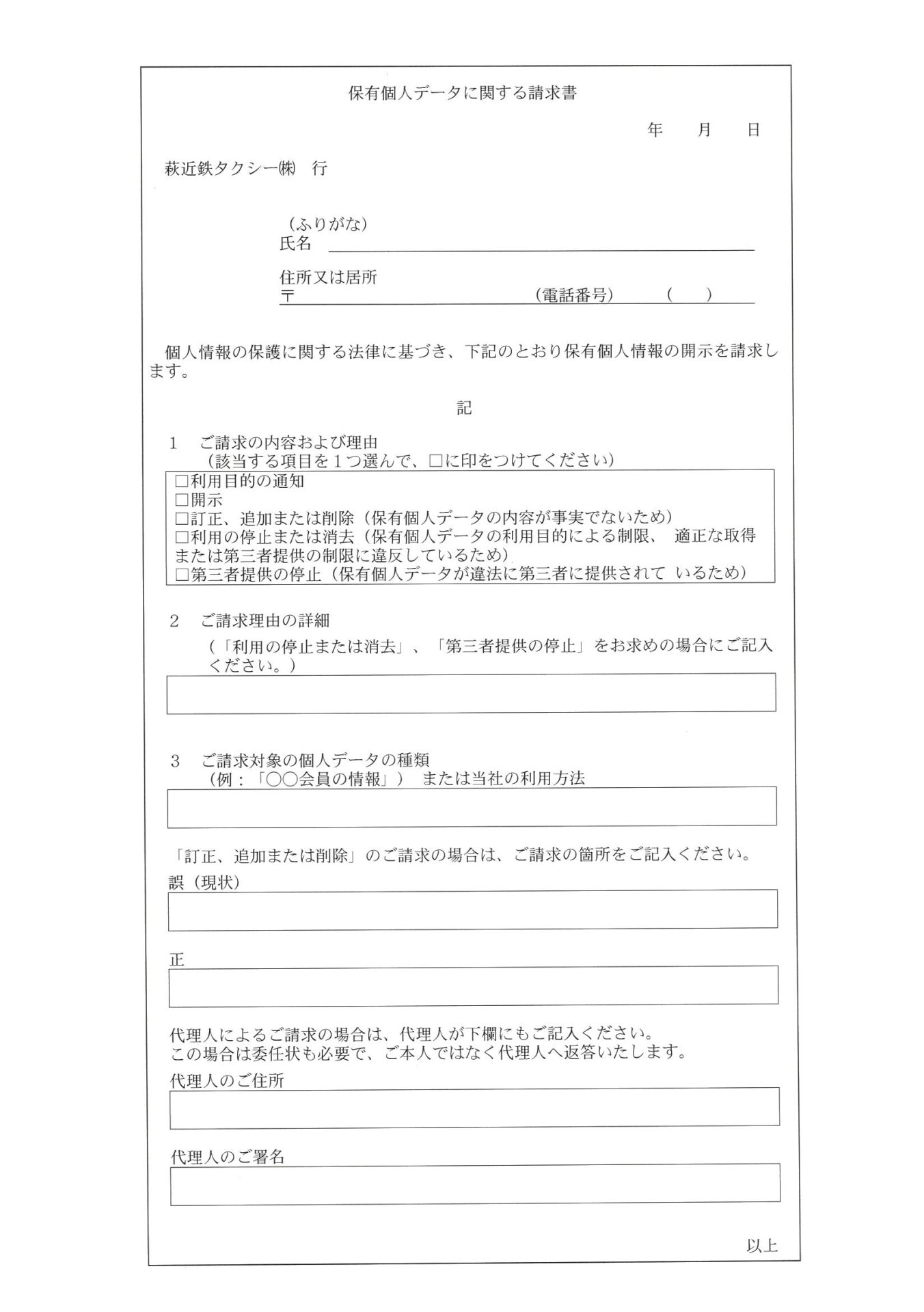 ほかの書式による場合には、開示等の請求をお受けできません。
